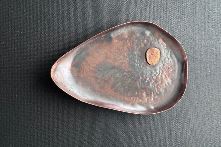 Copper, teardrop-shaped trinket tray. Oxidized with irregular edges and a rose-like hammered center. Buffed for a leather-like appearance. $155