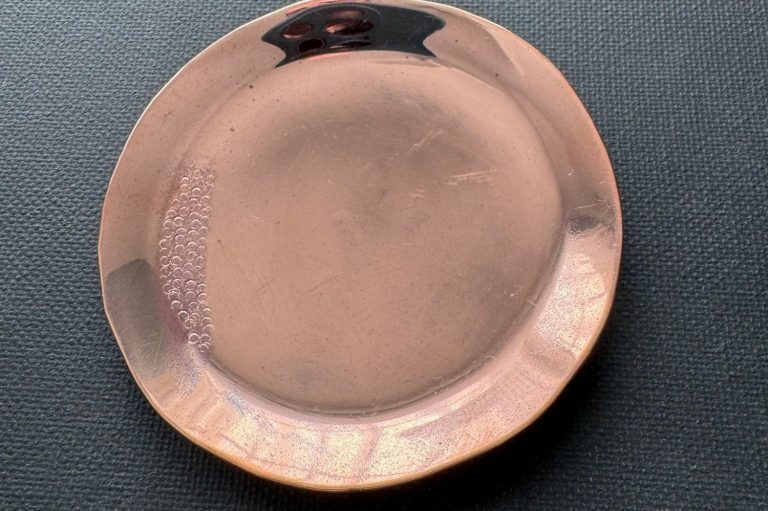 Copper round trinket tray. Textured to evoke bubbles on a lily pad, distressed and polished to high shine. $155