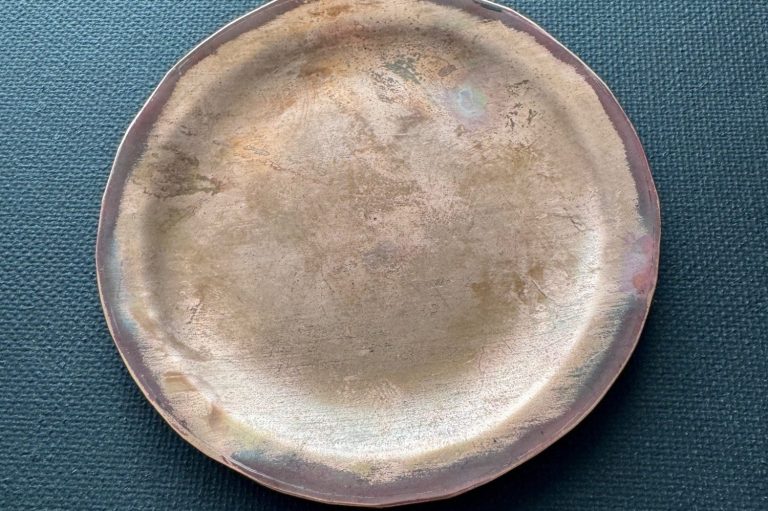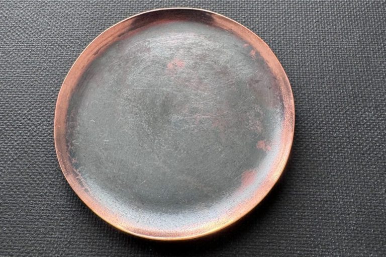Copper round trinket tray. Flame painted, oxidized and distressed, then brush polished to remove most of painting and oxidation. $155