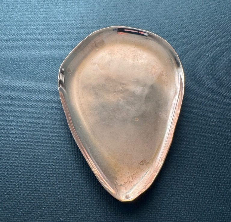 Copper, teardrop-shaped trinket tray. Polished and lightly distressed with a sprinkling of patina. $155