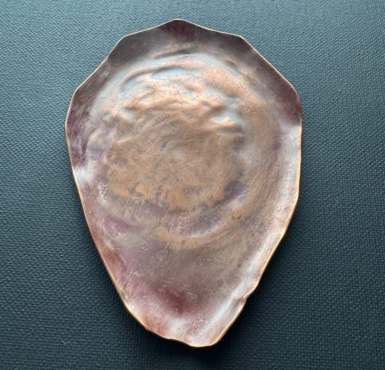 Copper, oval trinket tray. Shelf edge is hammered and polished, center is oxidized then lightly distressed. $155