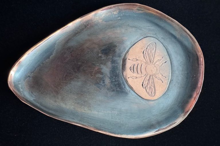 Copper, teardrop-shaped trinket tray, hammered with tiny bee charm. Oxidized and distressed. $155