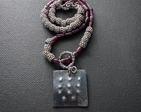 From the zombie apocalypse line, a choker shield that settles right in the V of the neck. On a strand of garnets and silver beads from Bali with a toggle clasp. $75 - SOLD
