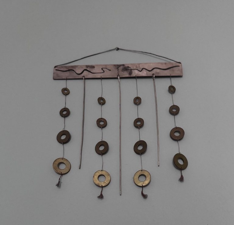 Whimsical silver and Brass abstract wall hanging. Serpents at top awaiting their meal of brass cheerios, with silver serpent staffs to control any sudden moves. $260 - SOLD