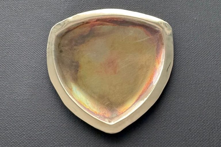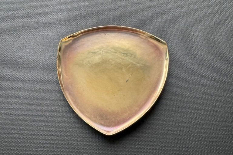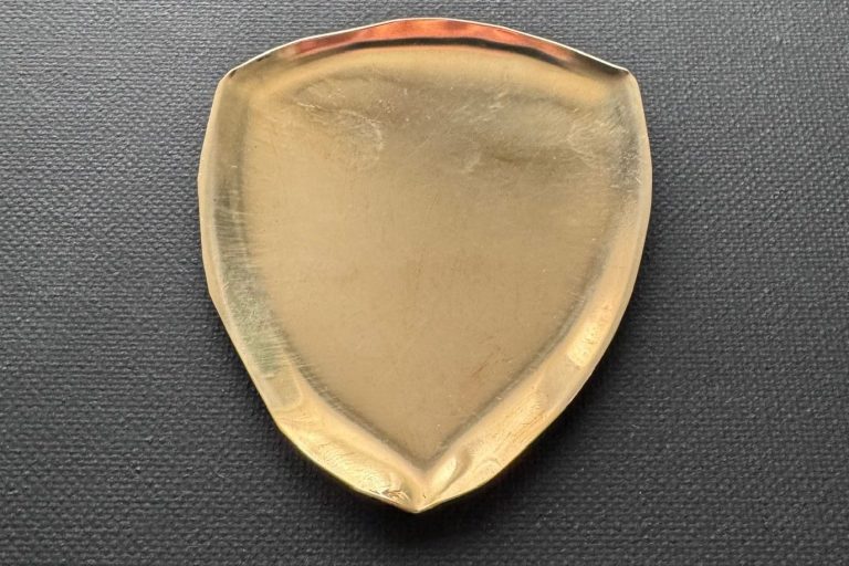 Polished brass, shield-shaped trinket tray, with pinch-bottom edge. Lightly distressed with a sprinkling of patina. $145