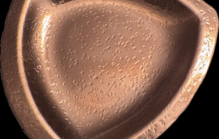 Bright polished copper, shield-shaped trinket tray, hammered in center and on shelf edge. Lightly distressed with a sprinkling of oxidation. $155