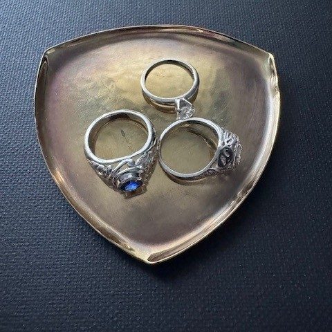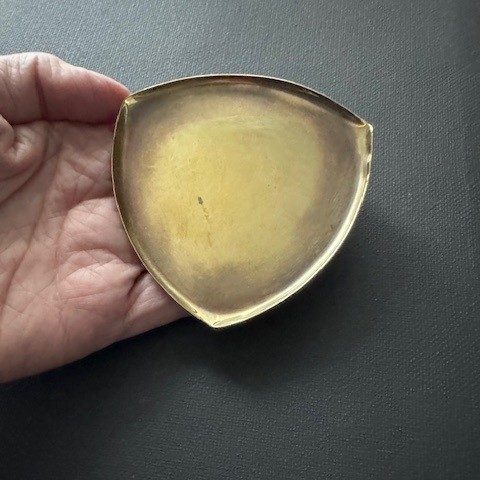 Polished brass, shield-shaped trinket tray. Oxidized center, polished shelf edges. Distressed. $145