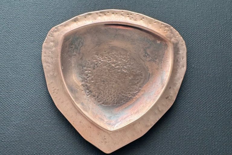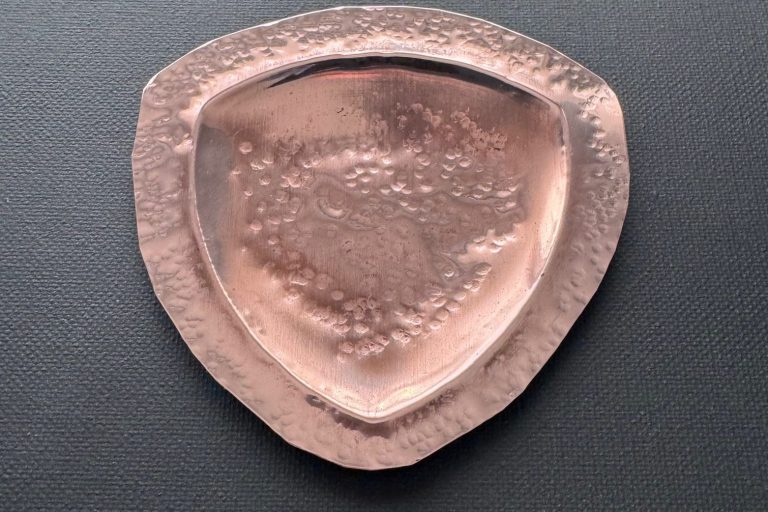 Copper, shield-shaped trinket tray, hammered in center and on shelf edge. Oxidized and distressed, with polished shelf edge. $155